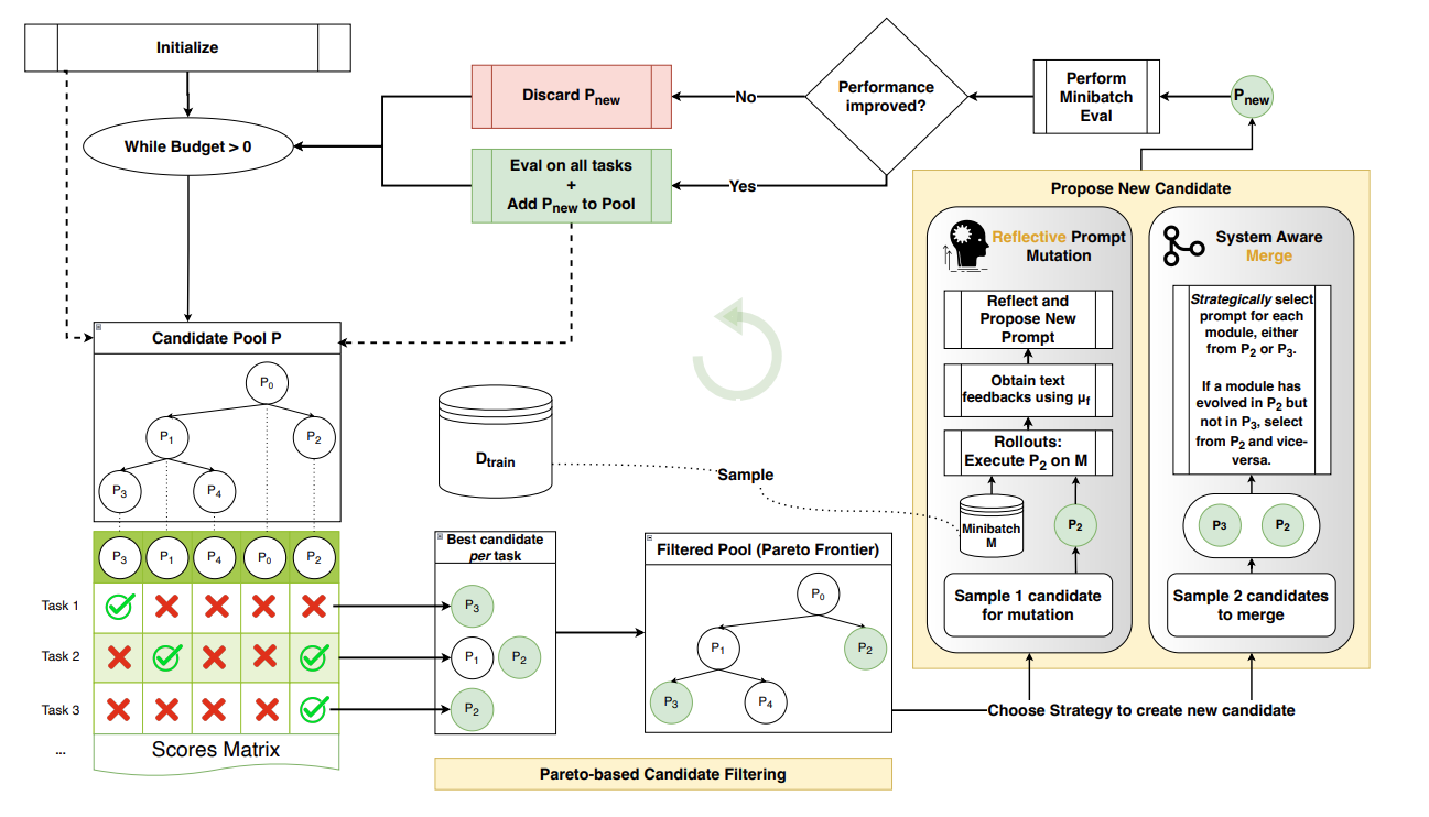 The key mechanical change: In normal GEPA, you have separate trainset (to learn from via reflection) and valset (to evaluate generalization). The Pareto frontier tracks per-instance performance on valset, preserving prompts that generalize well.