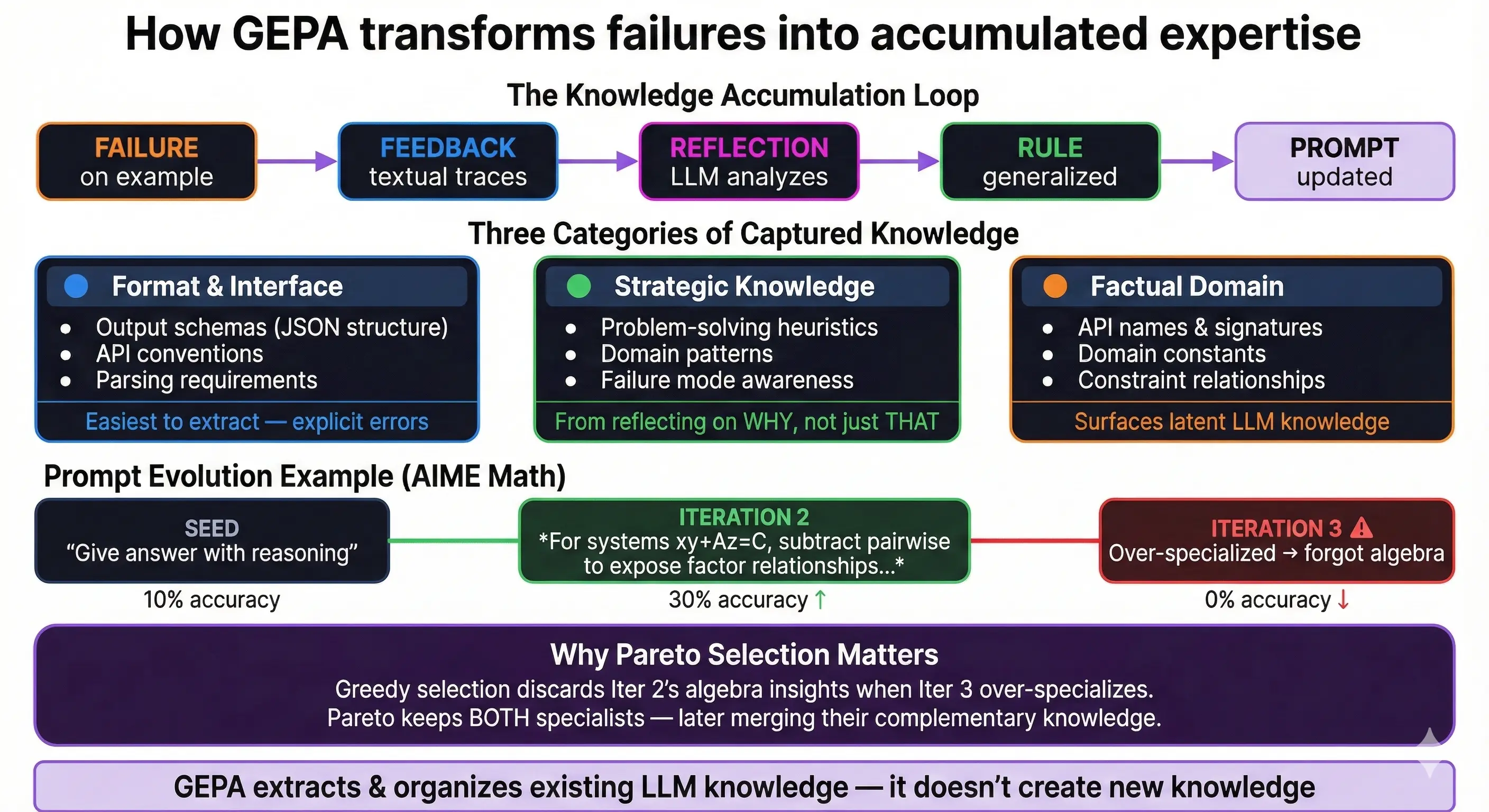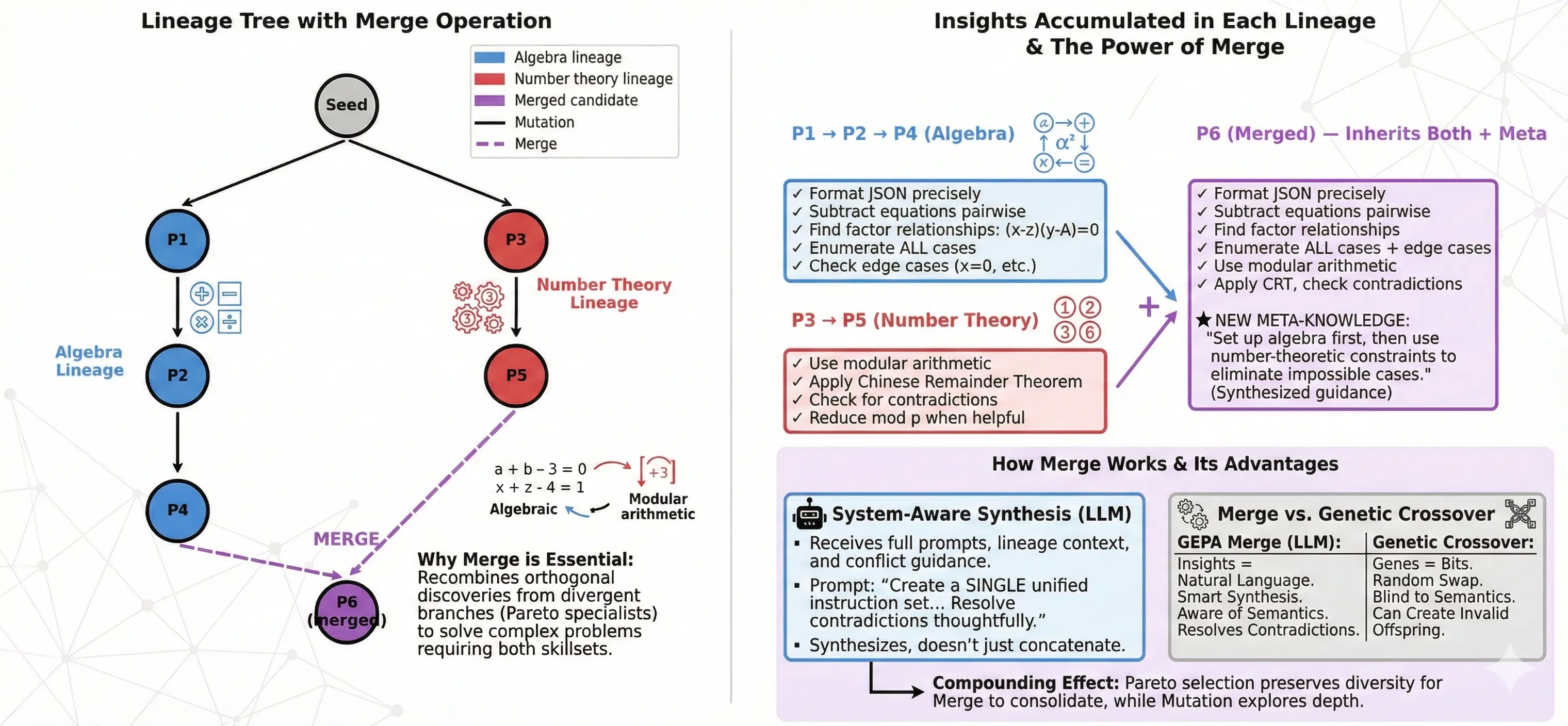 Pareto selection prevents this. By preserving prompts that are best on any validation instance, it keeps specialized knowledge around even when aggregate scores dip. The algebra specialist and number theory specialist both stay on the frontier, and the merge operation can later combine their insights.