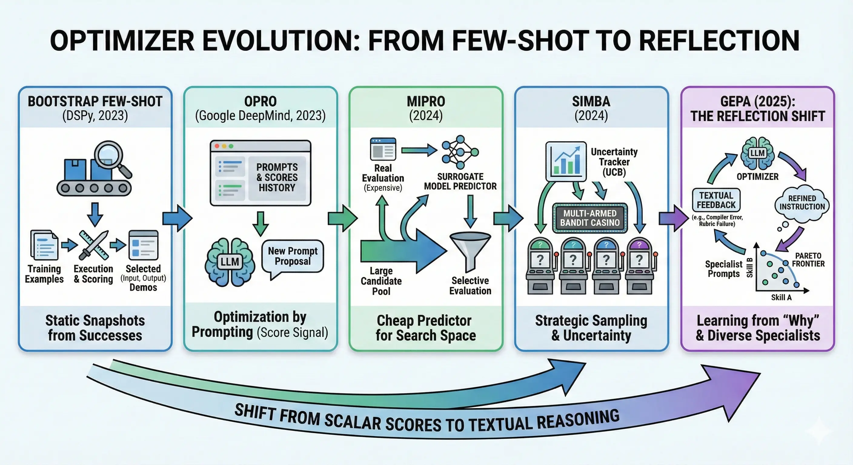 To understand where GEPA fits, it helps to trace the lineage of prompt optimizers. Each generation solved a limitation of its predecessor—and GEPA represents the latest capability unlock.
